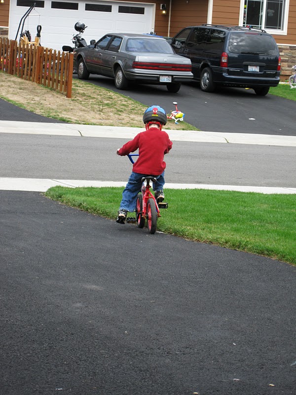 Isaac has decided he is ready to ride without training wheels. I think it has to do with the fact that I may have told him he couldn't have a scooter until he could ride his bike without training wheels. So Greg took the training wheels off and spent some time out with him. After about 20 mins of working with his dad, Isaac decided he wanted to practice by himself. He didn't do to bad.